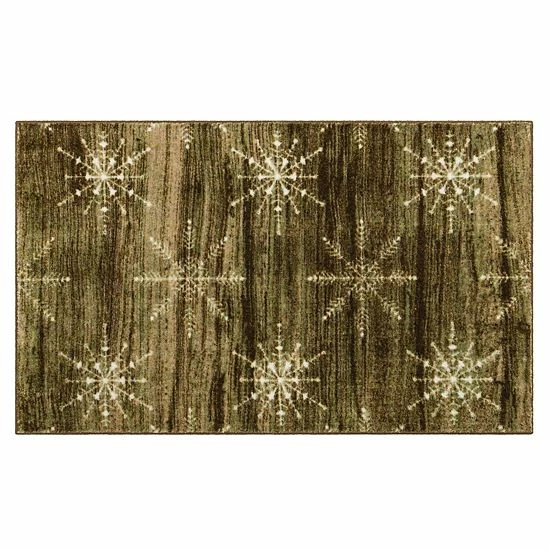 - Featuring light snowflakes on a rustic barnwood pattern, this cut pile rug is delightfully eye-catching