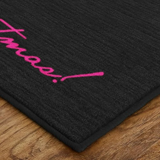 Put a chic twist on holiday decor with this rectangular polyester rug in black. Hot pink script with well wishes sits below multi-colored ornaments, in varying degrees of intricacy. Liven up a modern living room with the bright colors and glamorous imagery from this cut pile rug.