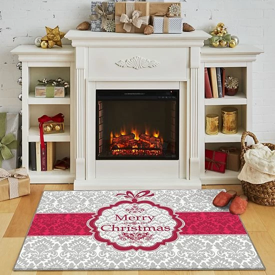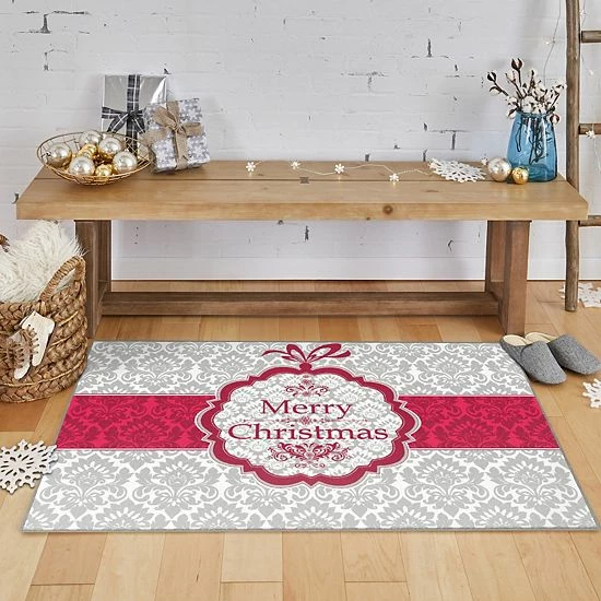 The damask pattern from this gray holiday rug features classic elements that warm up any living or dining room. Designed to emit a festive feel, the cut pile polyester design is simplified by a rectangular silhouette. Imagery that mimics the top of a present puts the finishing touch on a room full of cheer.