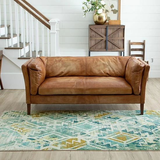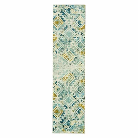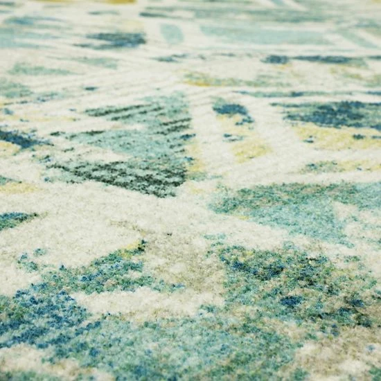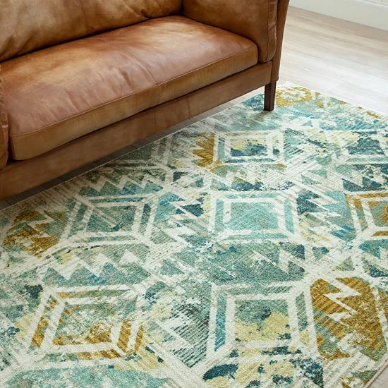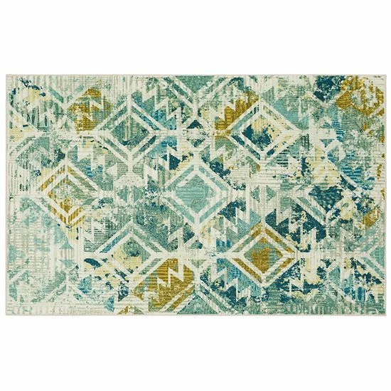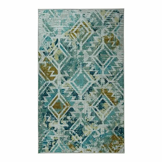 - A burnout zig-zag and diamond lattice pops amongst the painterly inspired splashes of green, aqua, navy, teal and beige colors in the distressed style of Mohawk Homes modern Danae area rug