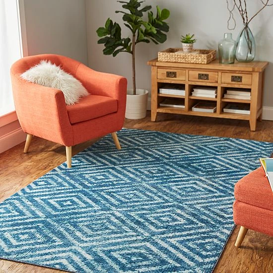Get the look and durability you’ve been searching for with this Mohawk Home Prismatic Distressed Diamond EverStrand rug. In teal.