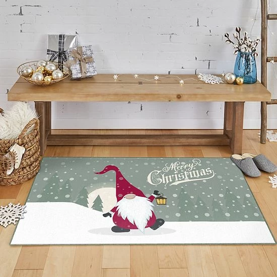 Designed with an illustrative pattern, this modern polyester rug is perfect for celebrating the holidays. Joyous in snow-filled bliss, this multi-colored rug highlights a merry gnome. The precision dye injected construction is complete with cut pile details.